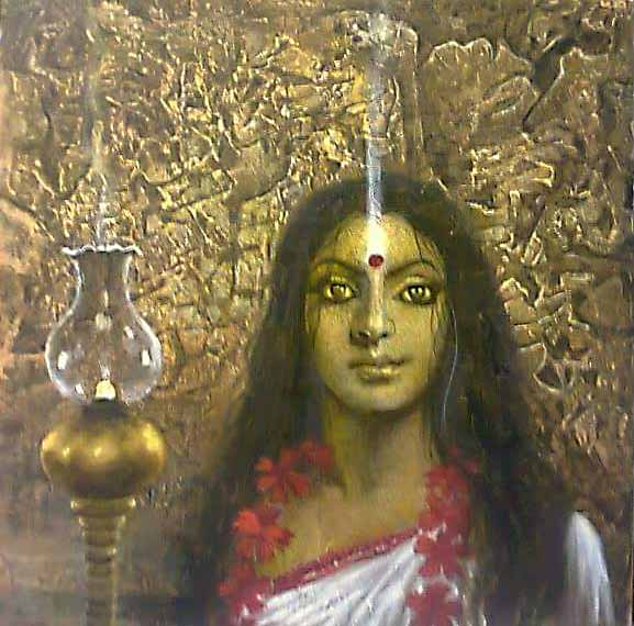 The Devi Series portrayed the woman in her divine glory. It depicted her in various forms and everyday mundane tasks. But beneath the garb of this banality there was a divine intrigue. The paintings touched that divine quality.
